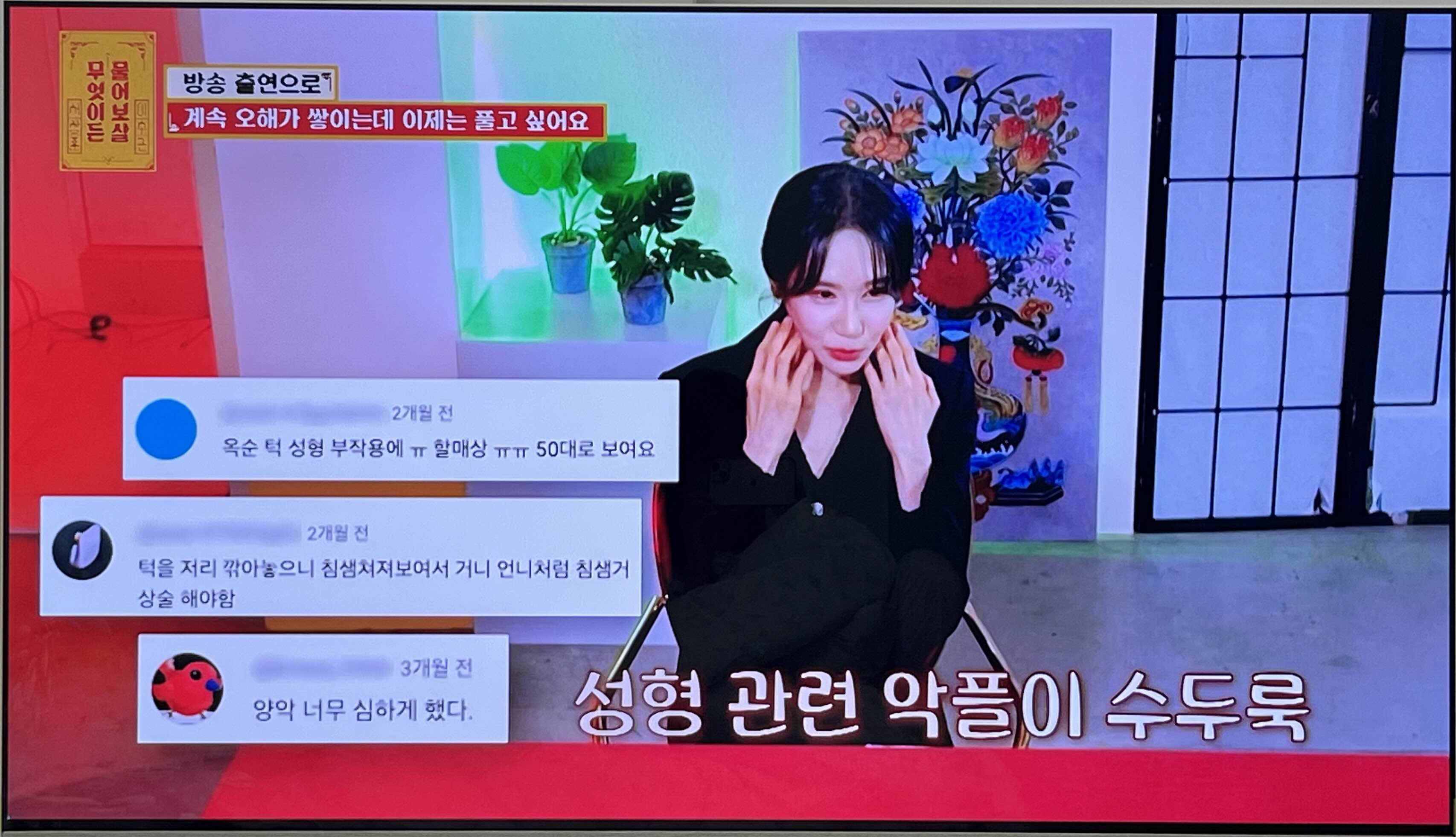 옥순님은 성형의혹도 시원하게 이야기 하셨는데요. 양악 했다는 댓글들이 많았는데 옥순님은 방송 출연 당시 살이 너무 빠져서 그렇다고 합니다. 사실 저는 성형을 했든 안 했든 그건 개인의 자유라 괜찮다고 생각하는데요. 굳이 그걸 또 악플로 다는 게 이해가 되진 않네요. 결론은 옥순님은 양악을 하지 않았다고 합니다.