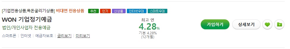 제가 조사한 다섯 개 은행중에 가장 금리가 높은 상품이 우리은행 won 기업정기예금이었습니다.