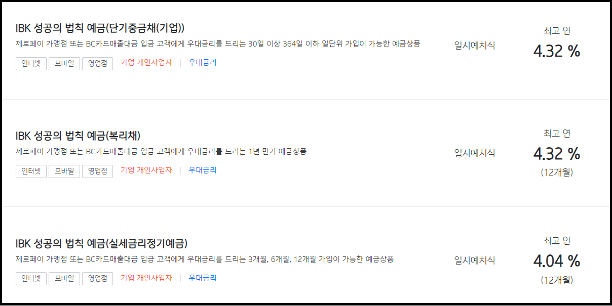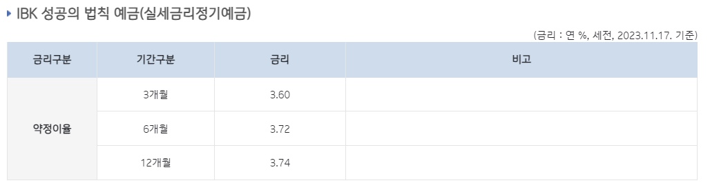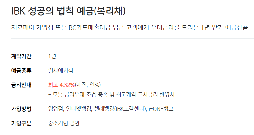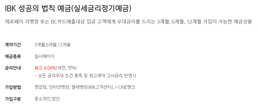 - IBK 성공의 법칙 예금(실세금리정기예금) : 예금자 보호법이 적용됨, 3개월 6개월 12개월 가입이 가능