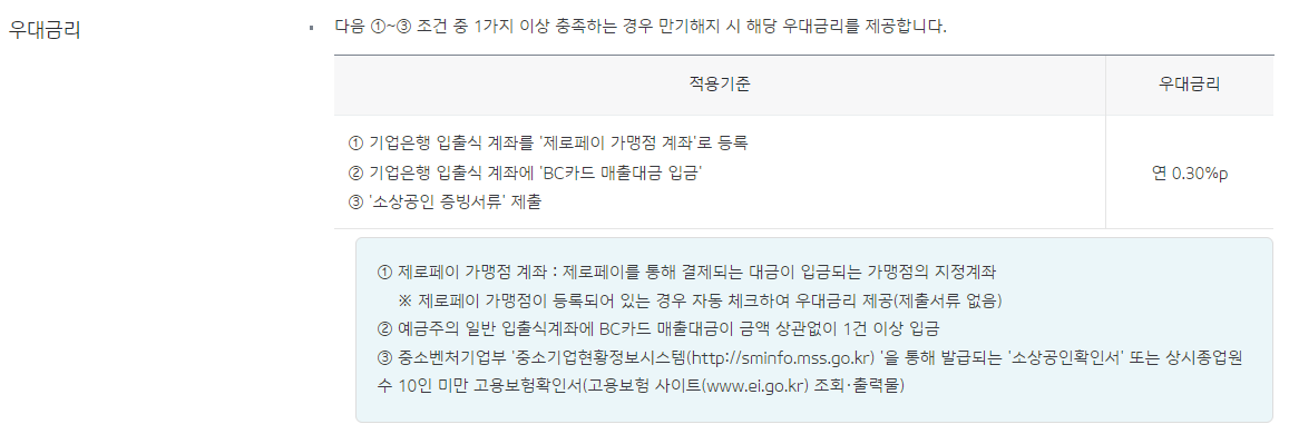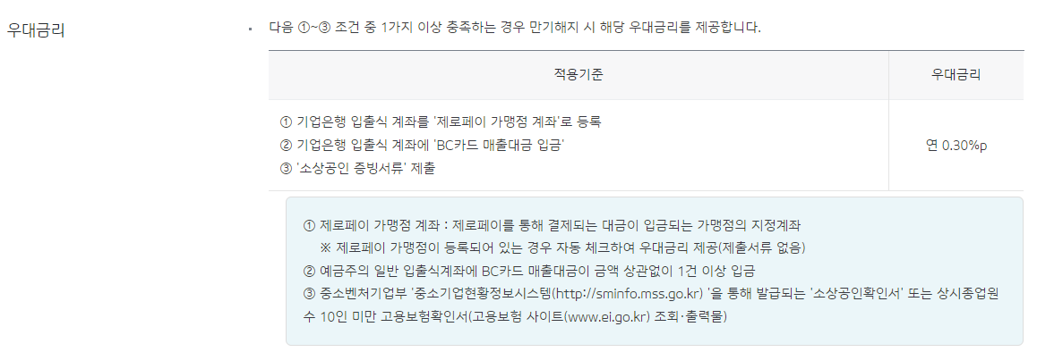 우대금리 : 0.03% (우대금리는 사진에 보이는 3가지 조건 중 하나를 충족해야 합니다.)
