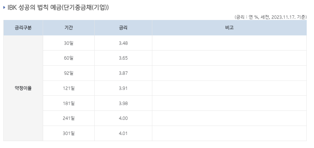 - IBK 성공의 법칙 예금 (단기중금채) : 예금자 보호법 적용이 안됨, 단기로 가입가능 (30일~364일 이하)