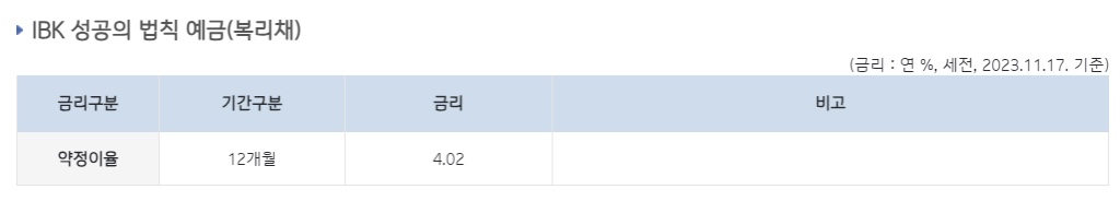 - IBK 성공의 법칙 예금 (복리채) : 예금자 보호법 적용이 안됨, 1년(12개월) 가입 가능 상품