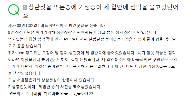 첫번째, 혹시 모르니 기생충 사진을 꼭 찍으세요. 되도록이면 증거자료를 남겨야 피해보상을 받으실 수 있습니다.