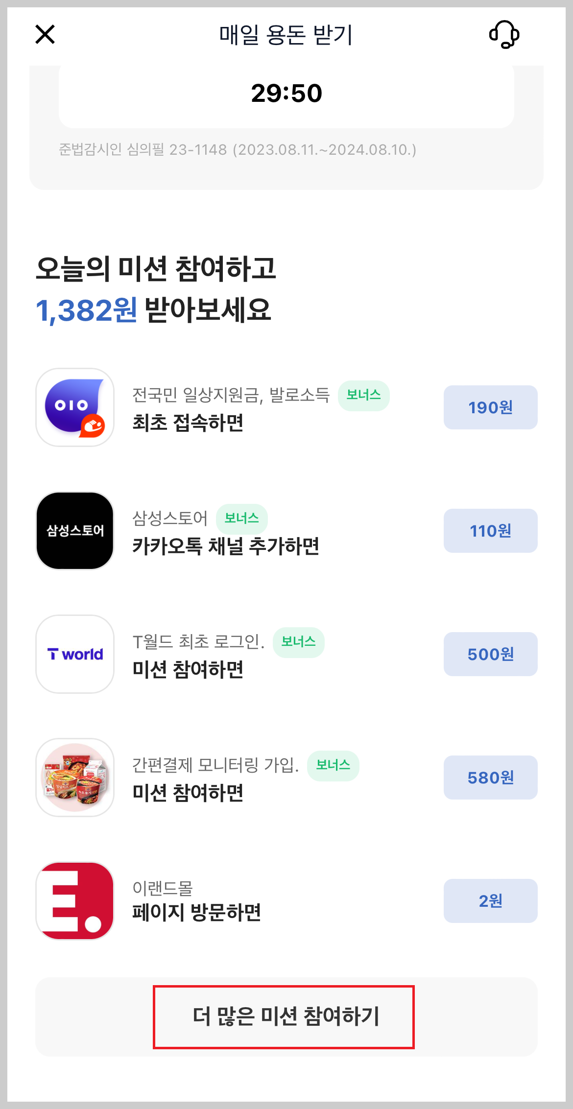 (5) 더 많은 미션 참여하기를 누르면 더 많이 참여할 수 있습니다.