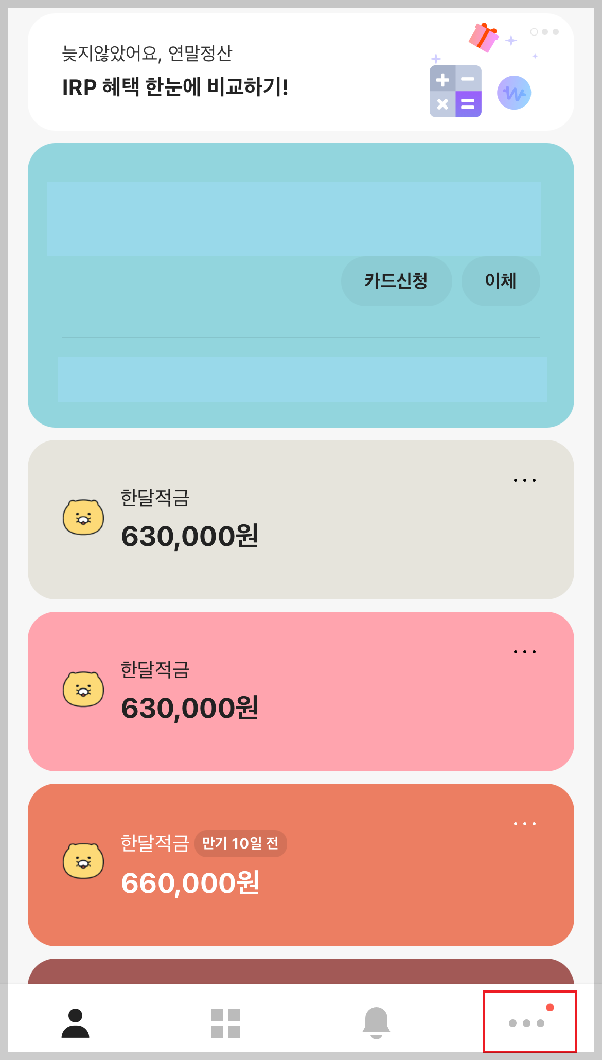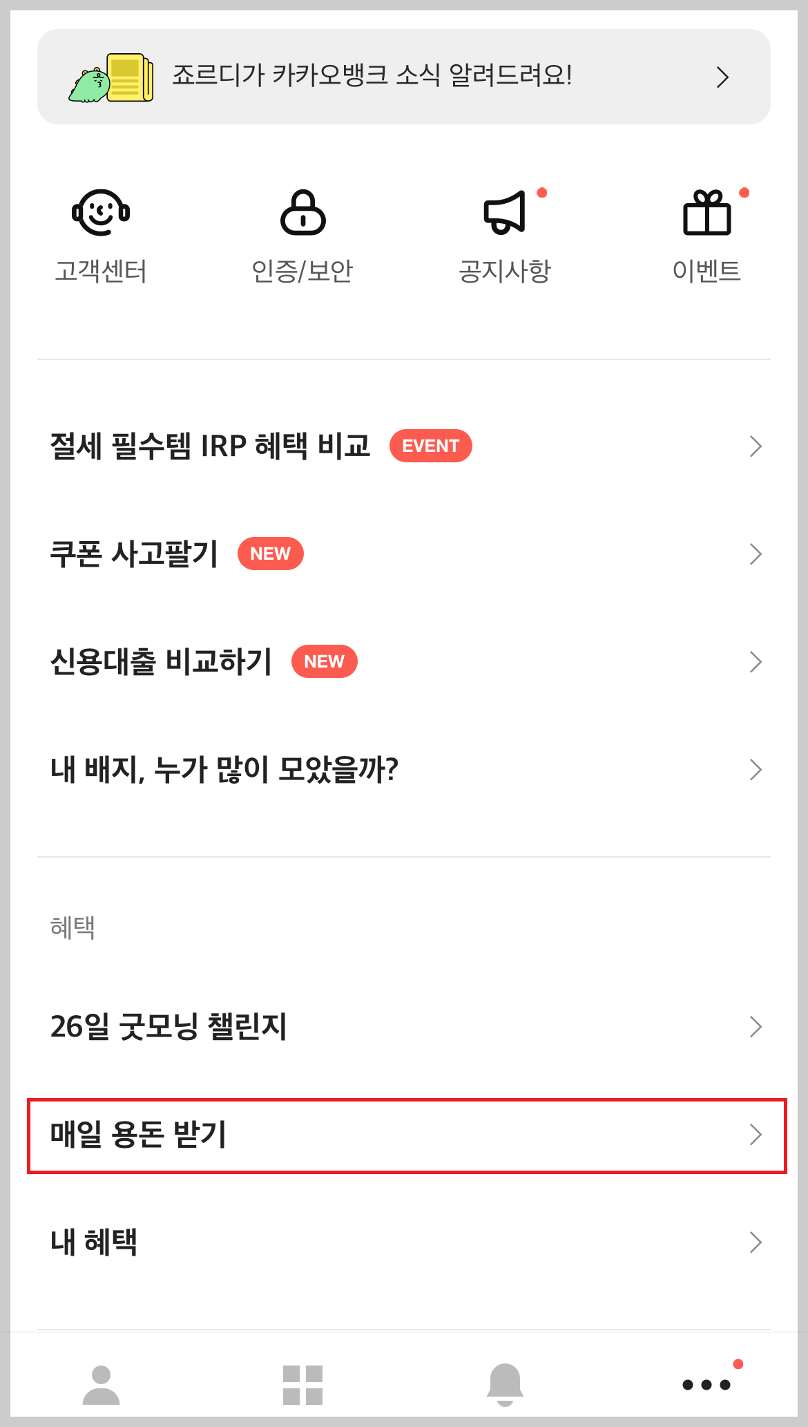 (1) 카카오뱅크 어플 실행 후 하단에 점세개(더보기)를 눌러줍니다.