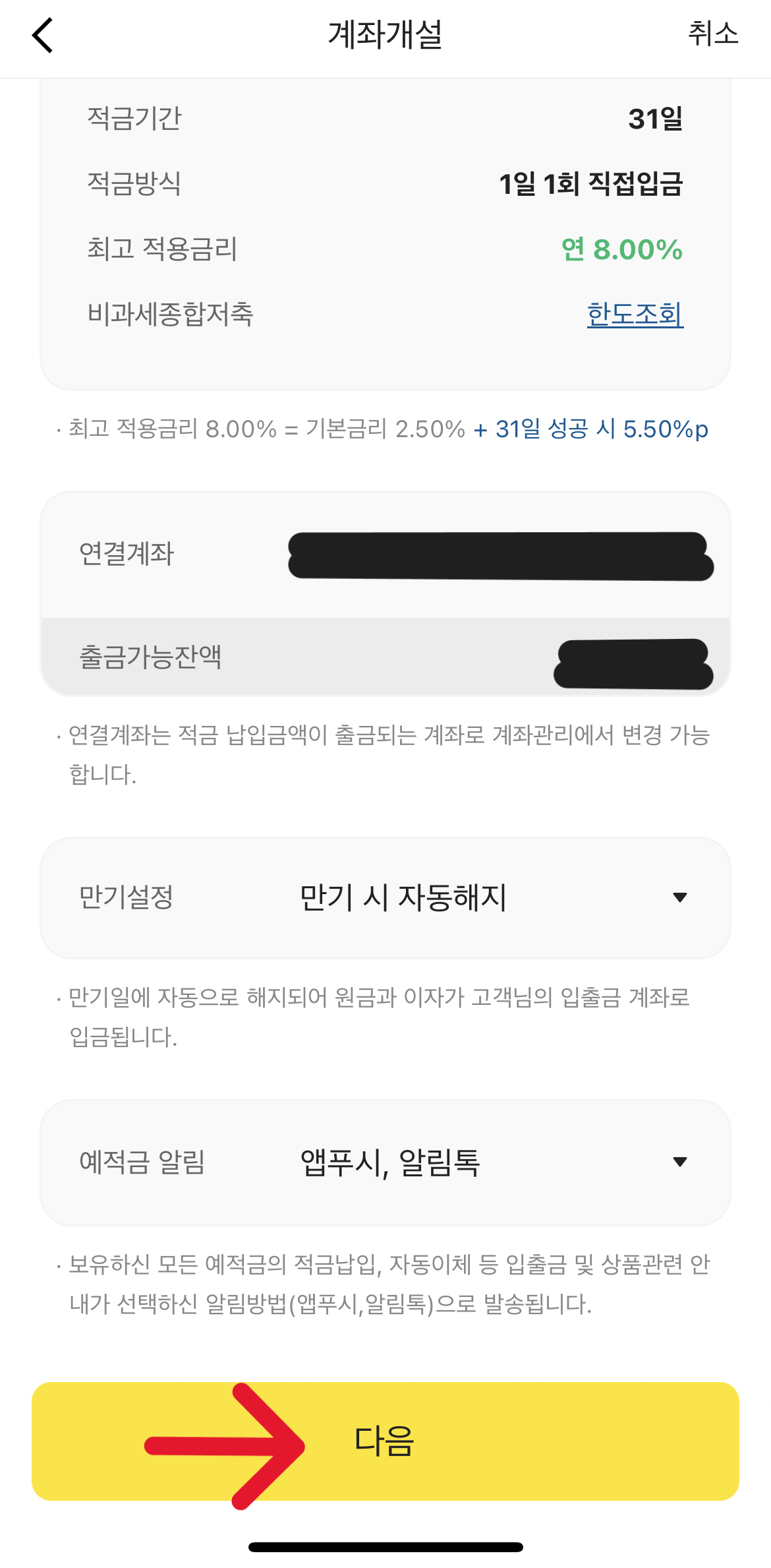 (9) 만기설정, 알림 방법 선택 후 다음 클릭