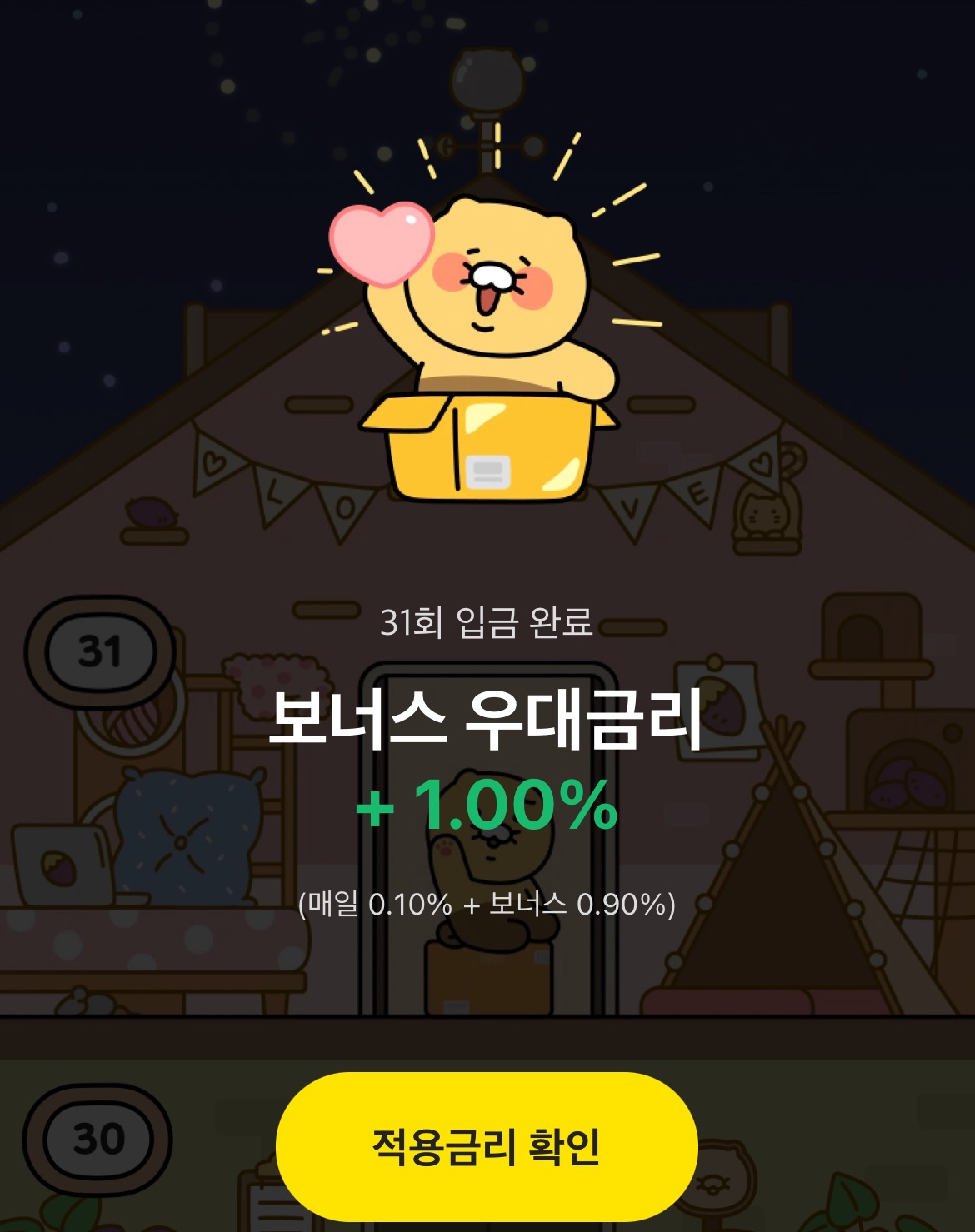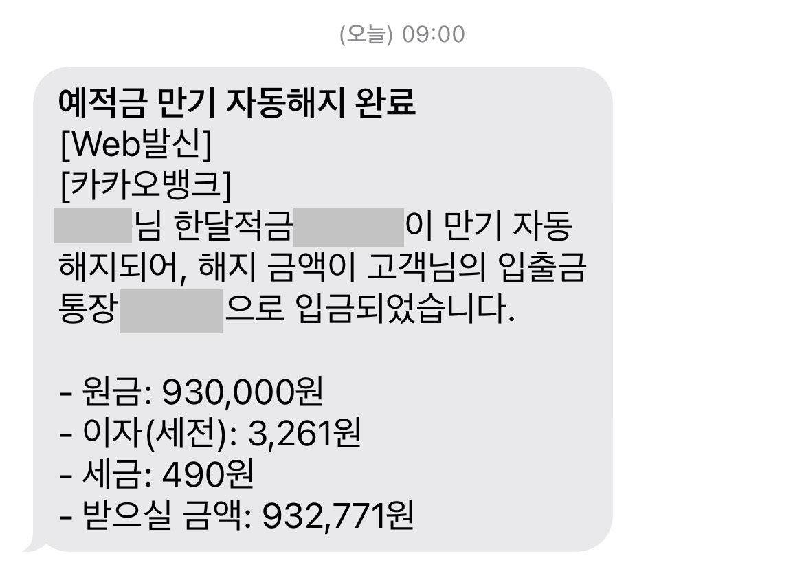 카카오뱅크 한달적금 만기 원금 이자 수령 후기