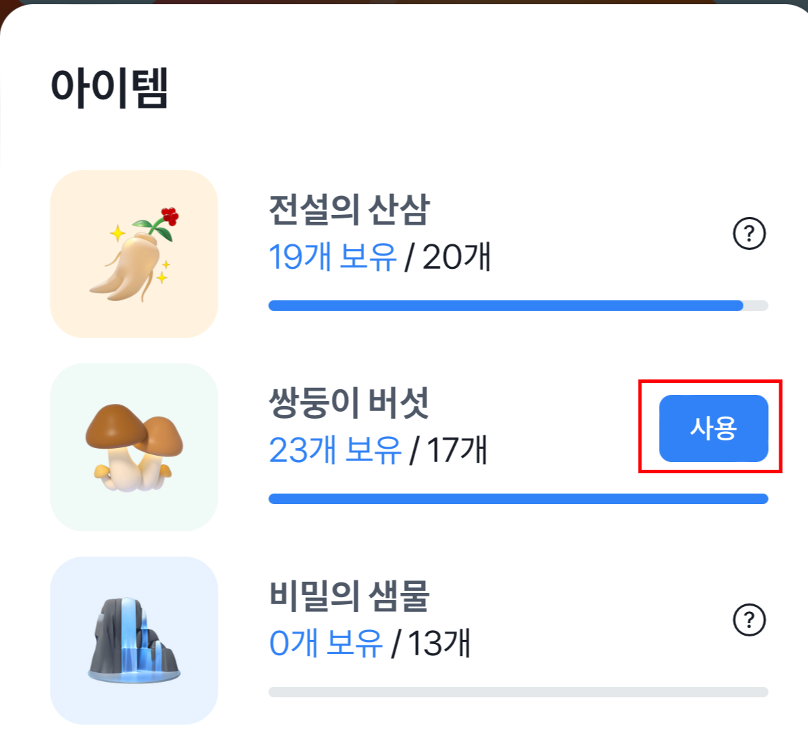 (2) 사용 방법 : 쌍둥이 버섯 아이템 옆에 사용 버튼을 눌러줍니다.