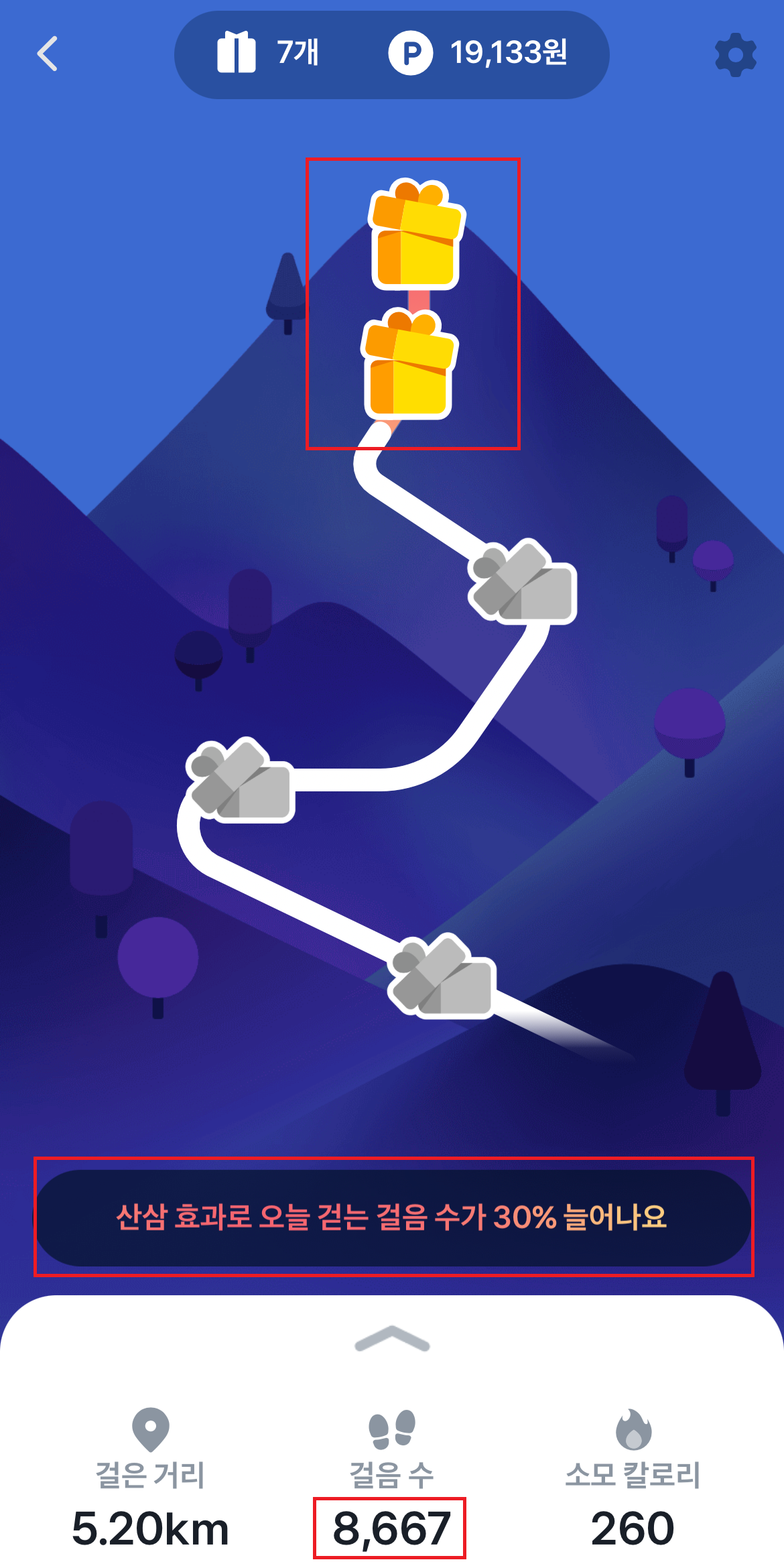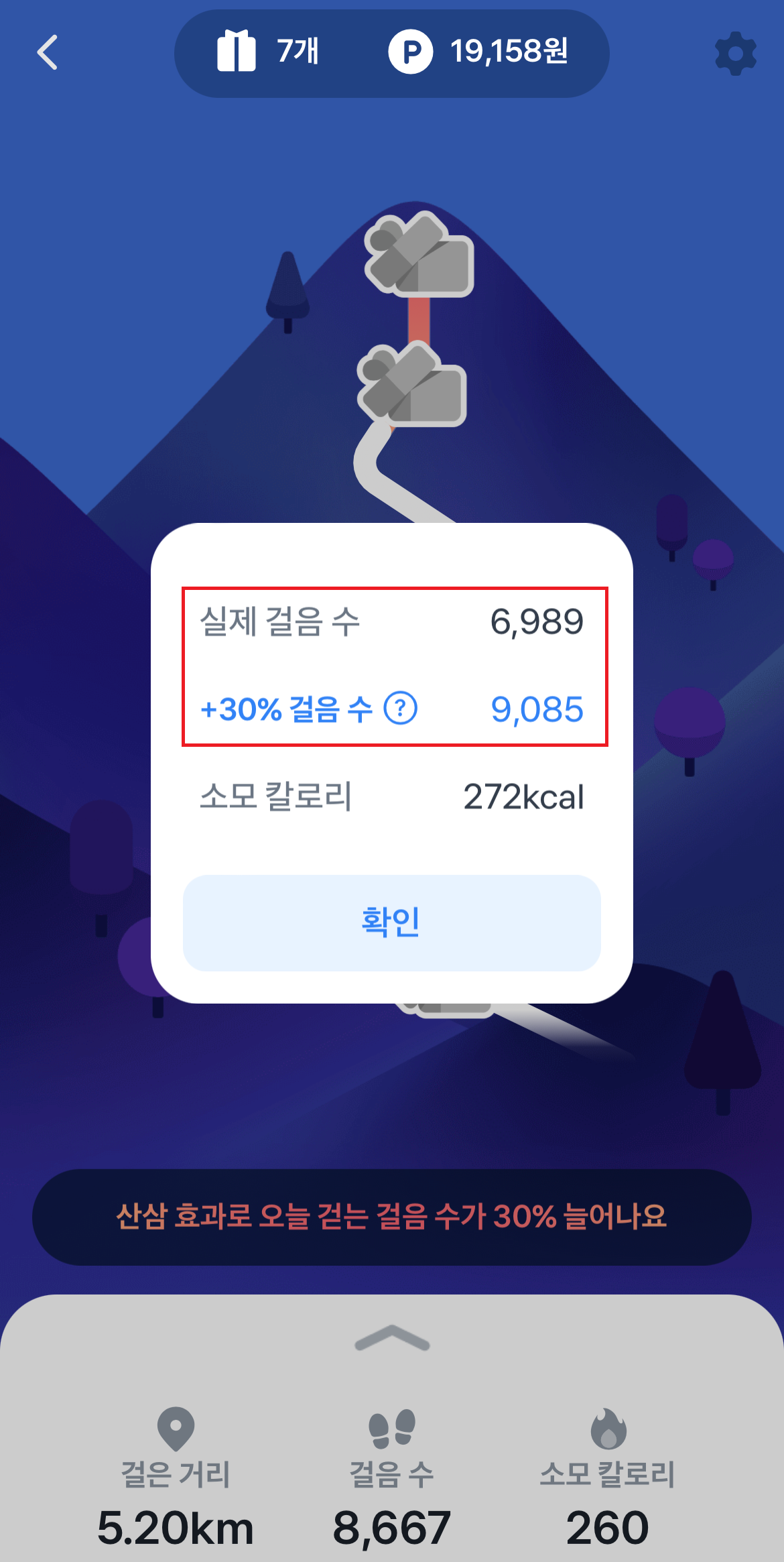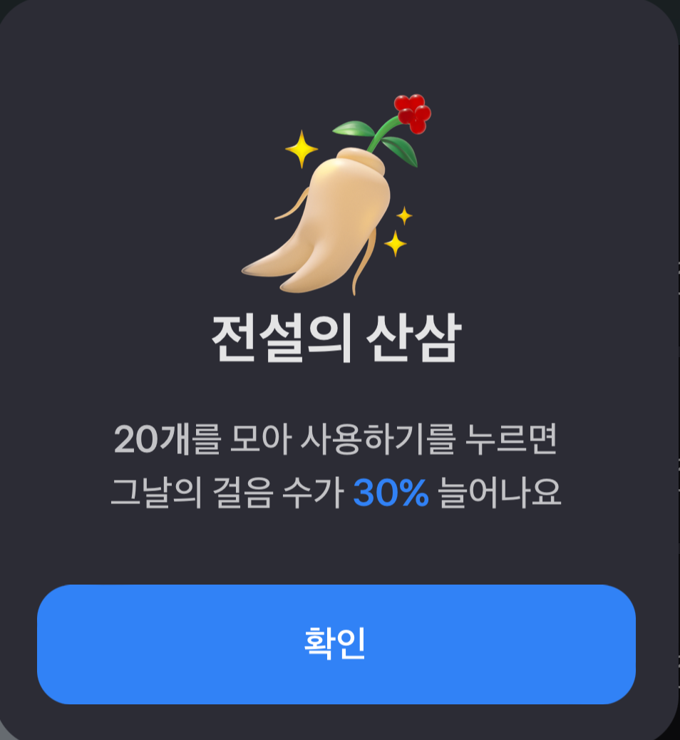 (1) 효과 : 20개를 모아 사용하기를 누르면 그날의 걸음 수가 30% 늘어납니다.