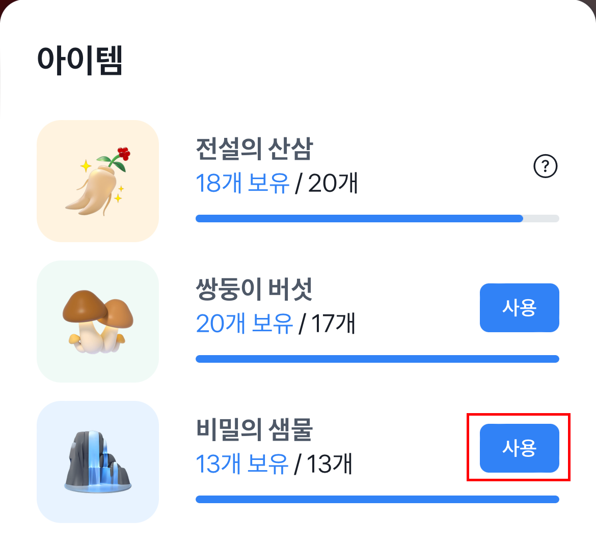 (2) 사용방법 : 비밀의 샘물 아이템 옆에 사용버튼을 눌러줍니다.