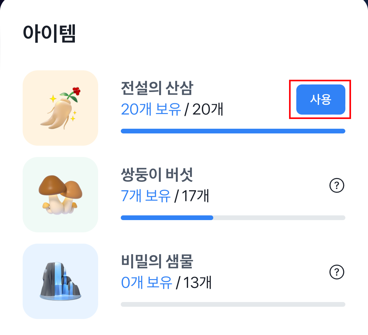 (2) 사용방법 : 전설의 산삼 아이템 옆에 사용버튼을 눌러줍니다.