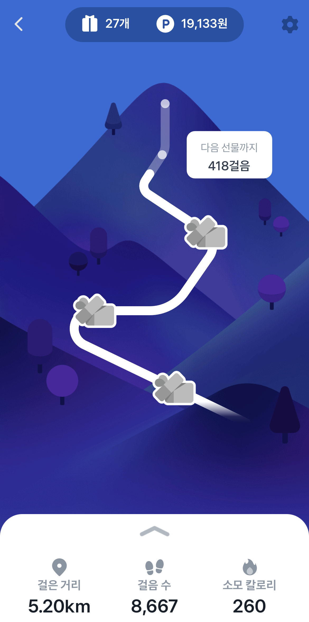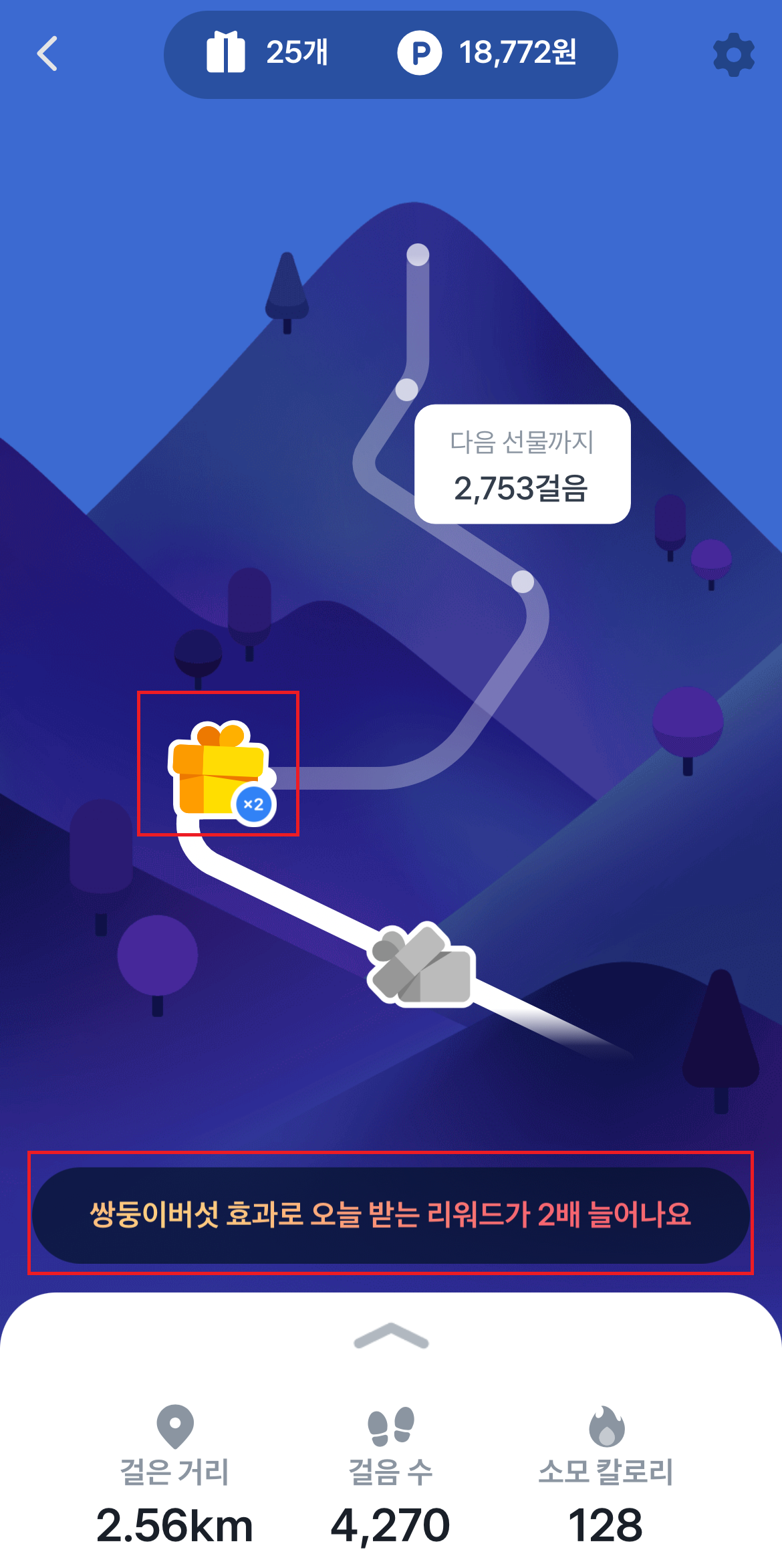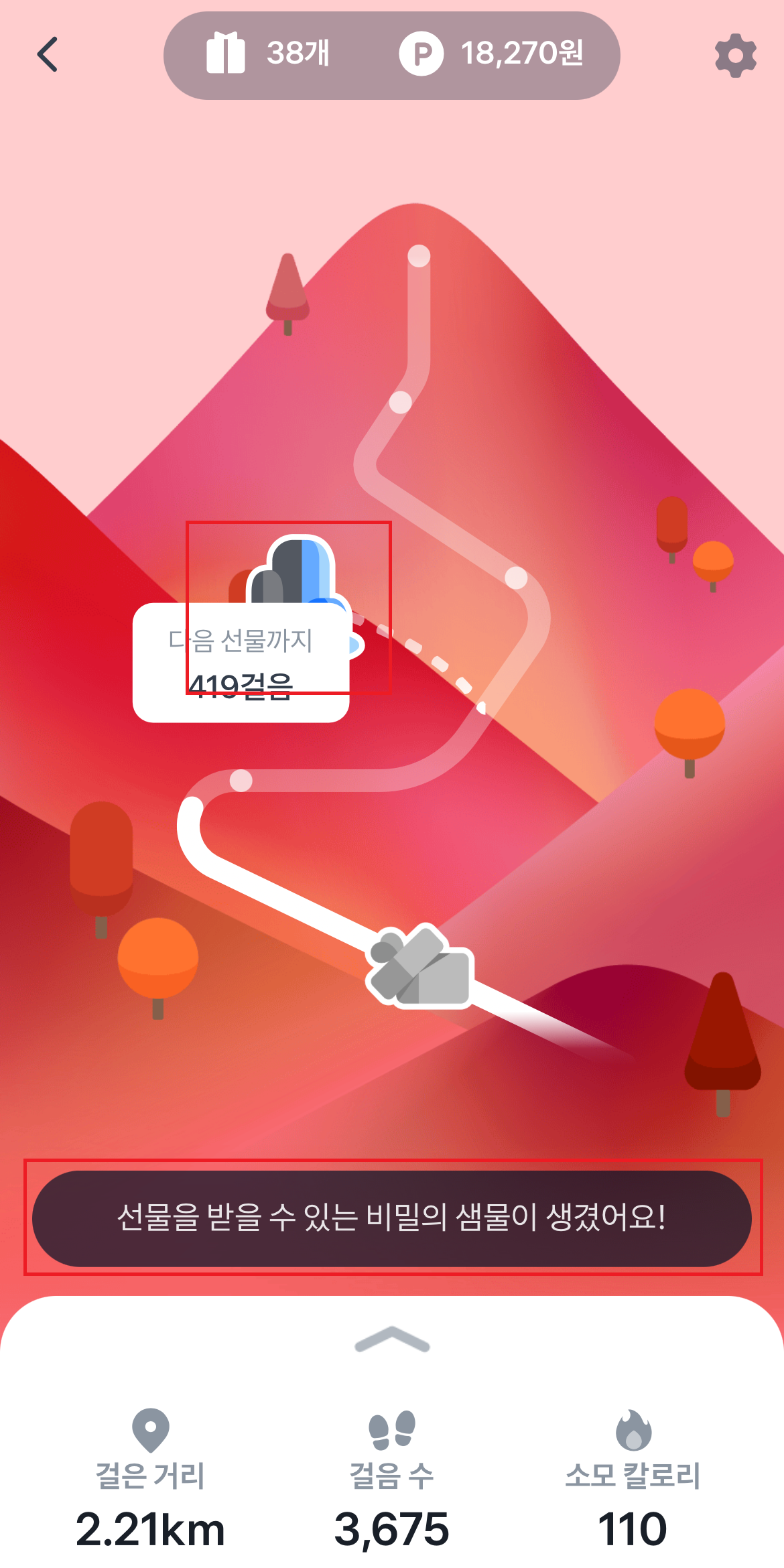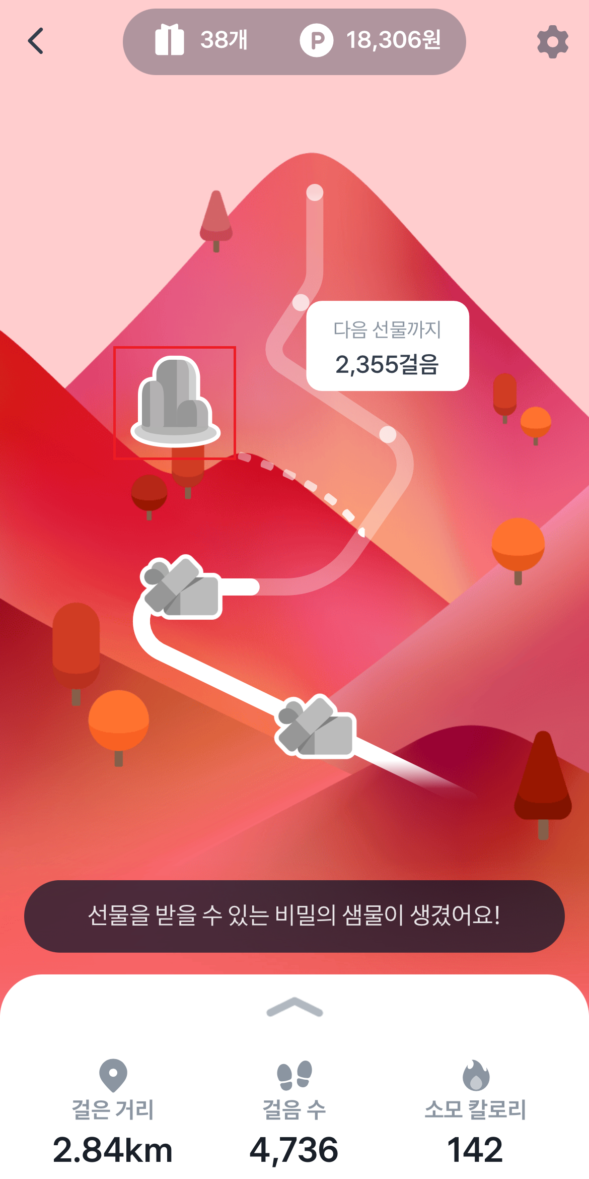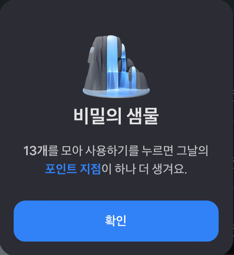 비밀의 샘물 아이템은 사용하면 만보기 화면 중간에 비밀의 샘물이 생깁니다. 지점이 있어서 걸음수를 비밀의 샘물 지점까지 채워야 포인트를 받을 수 있는 건가 했는데 아니었습니다. 비밀의 샘물이 생긴 곳을 누르기만 하면 바로 포인트를 지급해 줍니다.