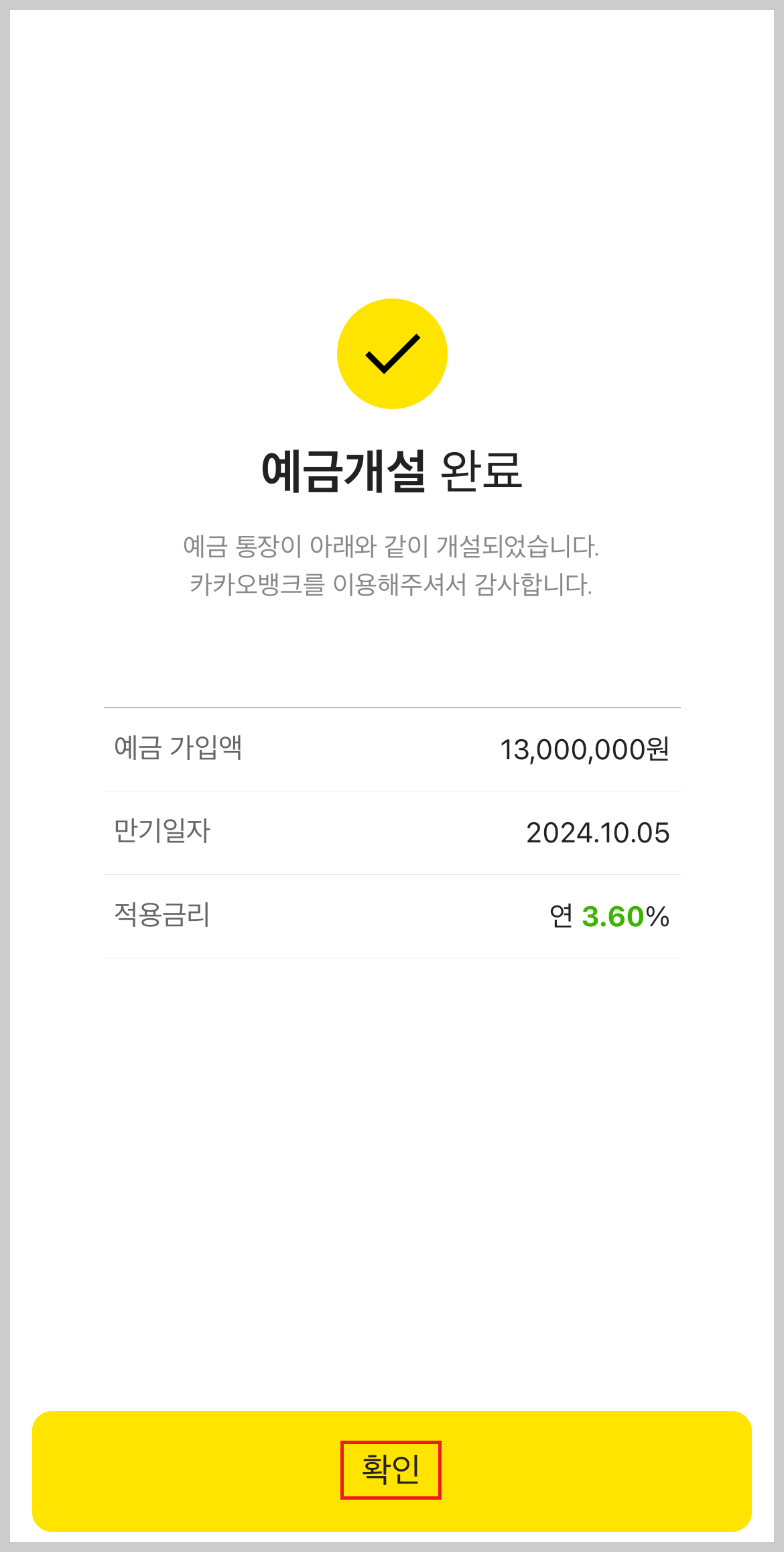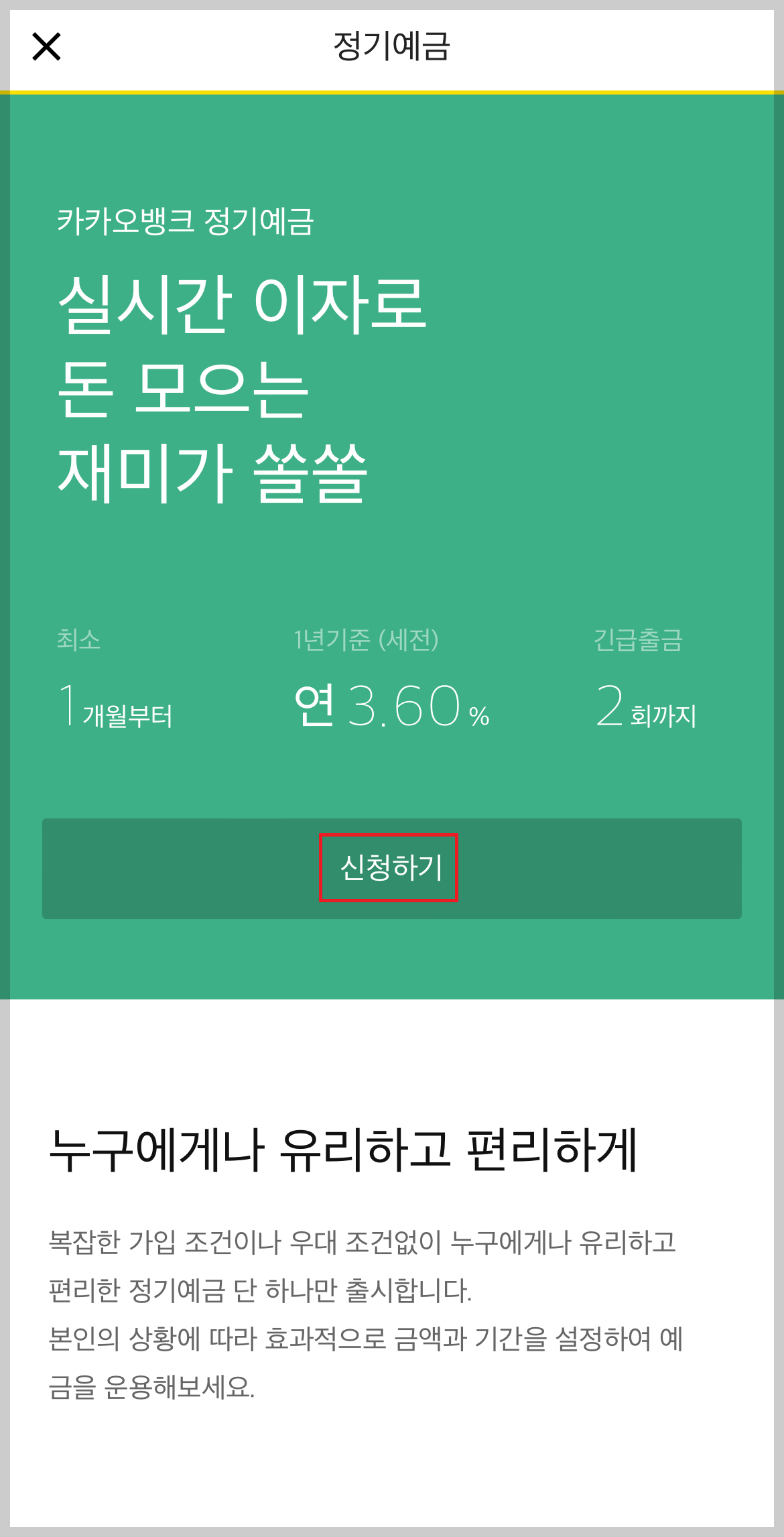 1년 이내 목돈을 쓸 일이 있을 거 같아 1년 이내로 자유롭게 가입할 수 있는 예금을 원해서 카카오 뱅크 정기예금을 가입했어요!