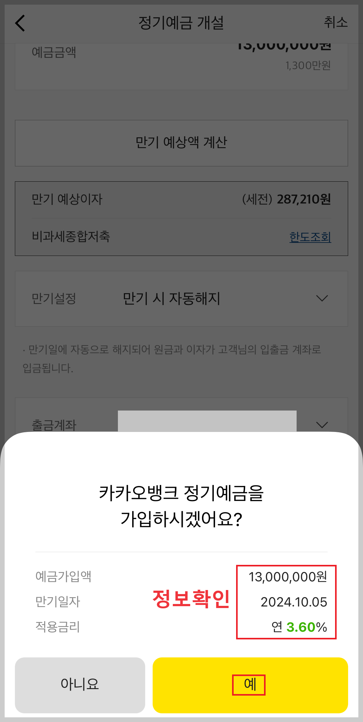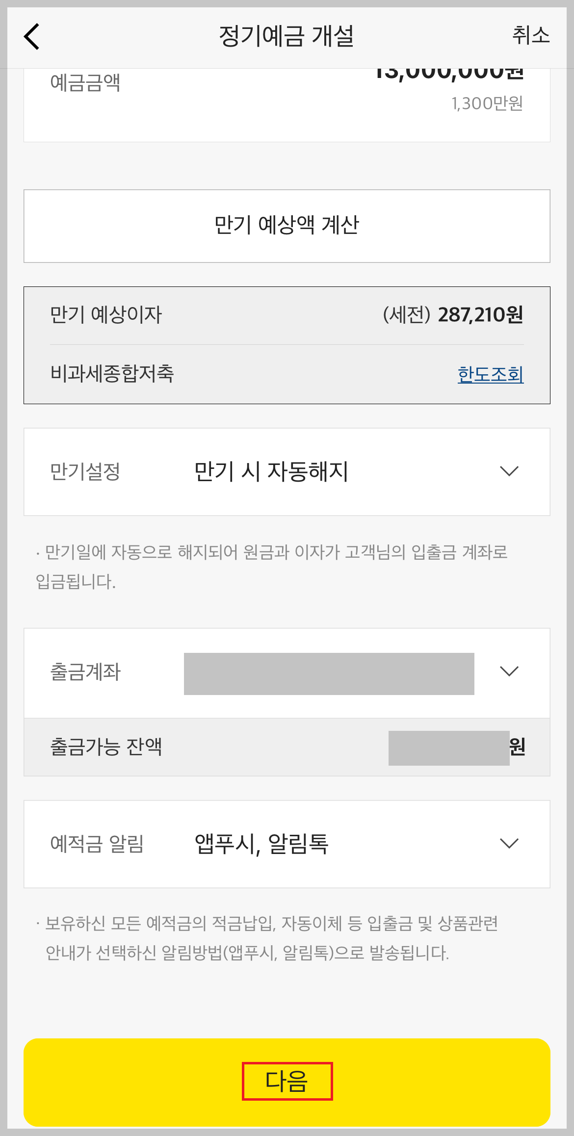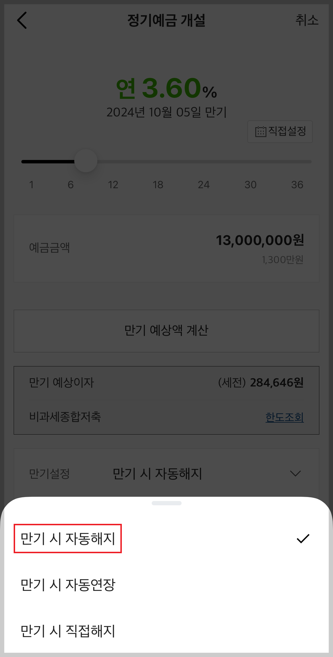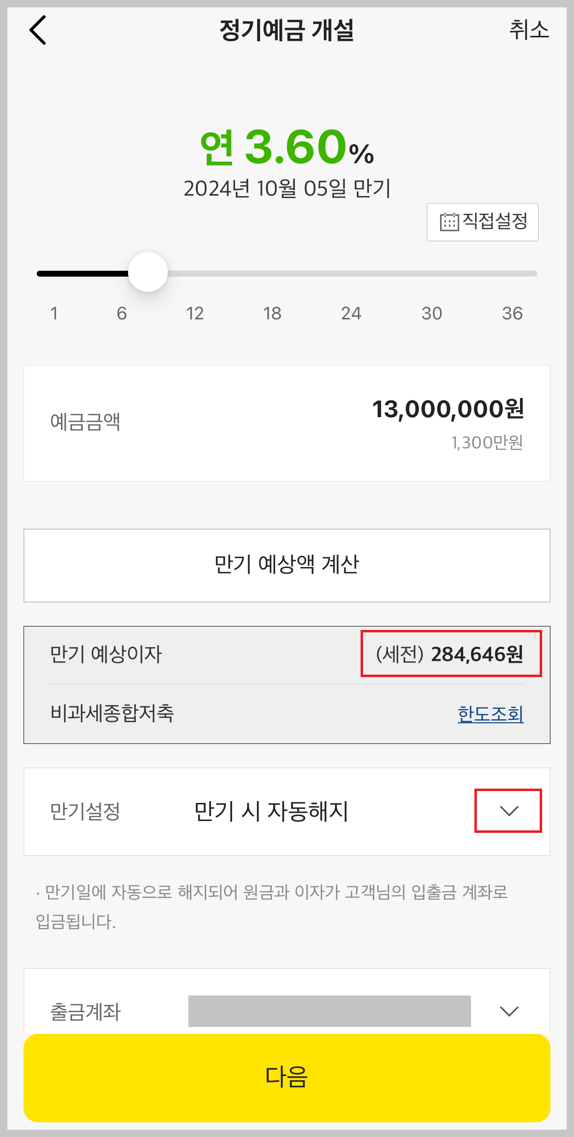 (8) 세전이자를 확인하고 만기설정을 눌러주세요.