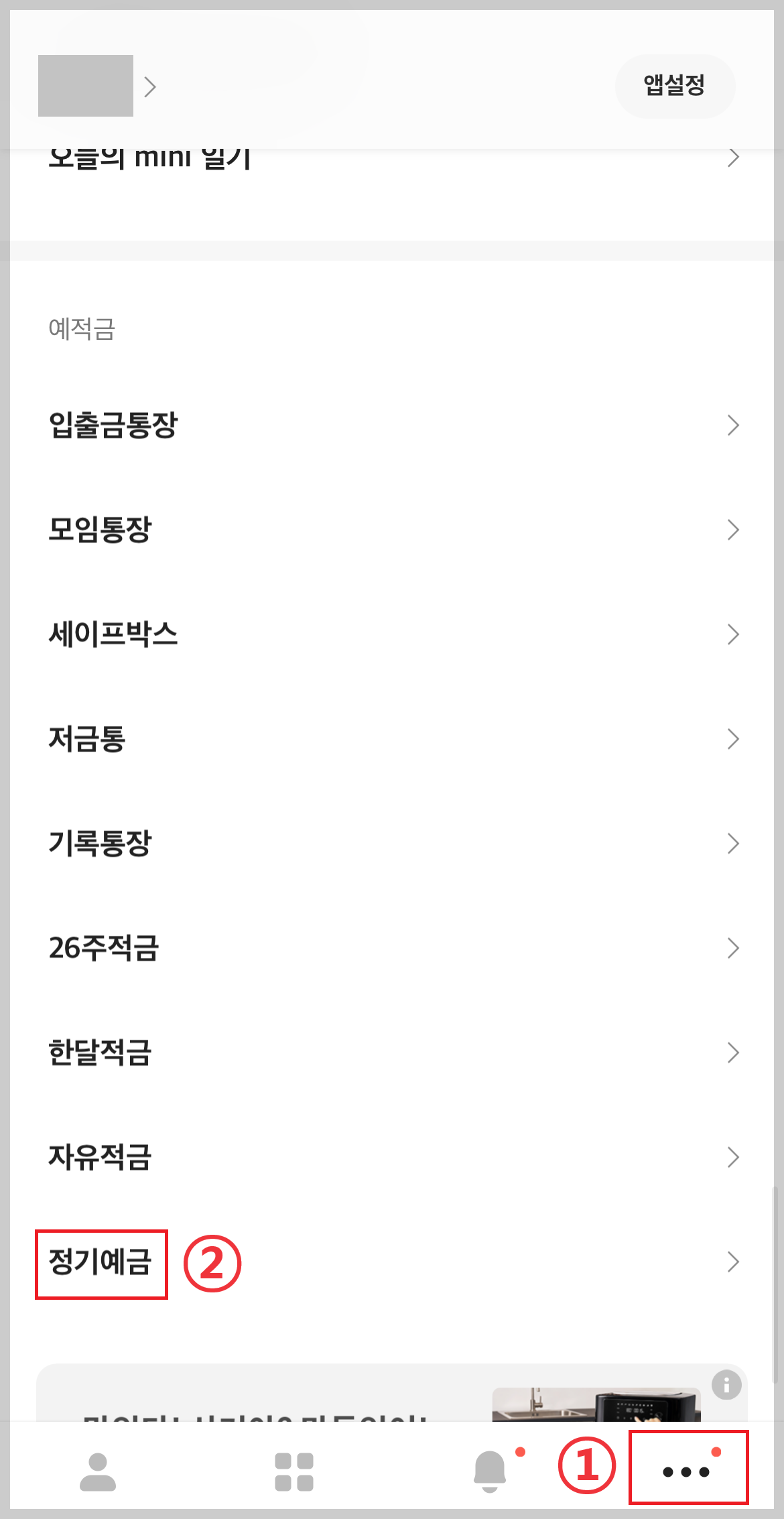 (1) 카카오뱅크 어플 실행 후 하단 점 세 개를 누르고 정기예금을 눌러주세요.