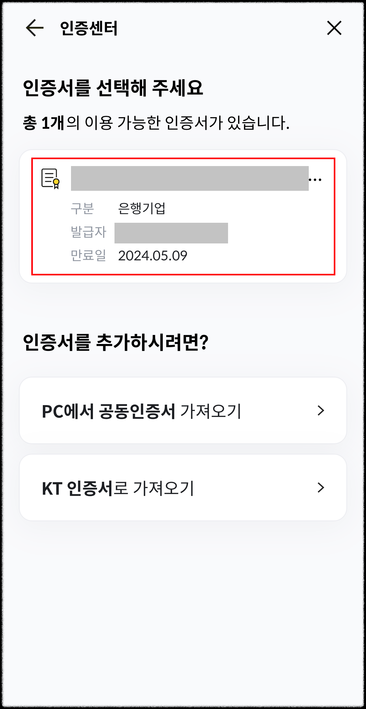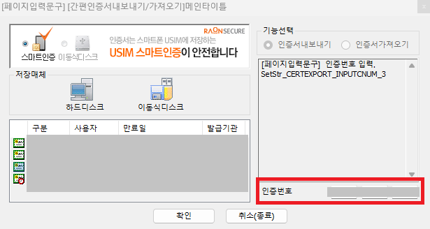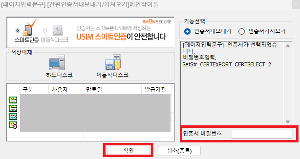 15. 가져올 공동인증서를 클릭하신 후 인증서 비밀번호를 입력하고 확인을 누릅니다.