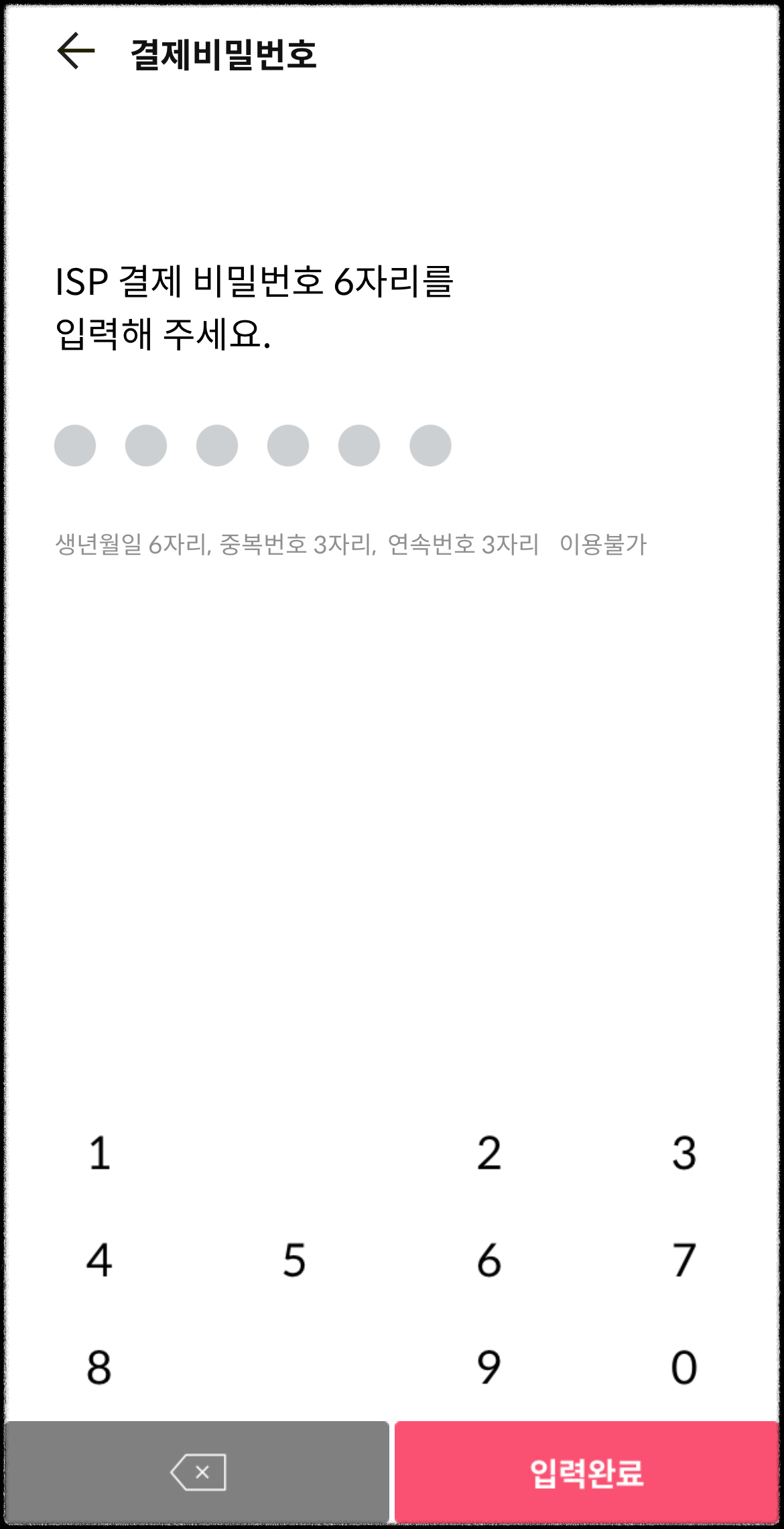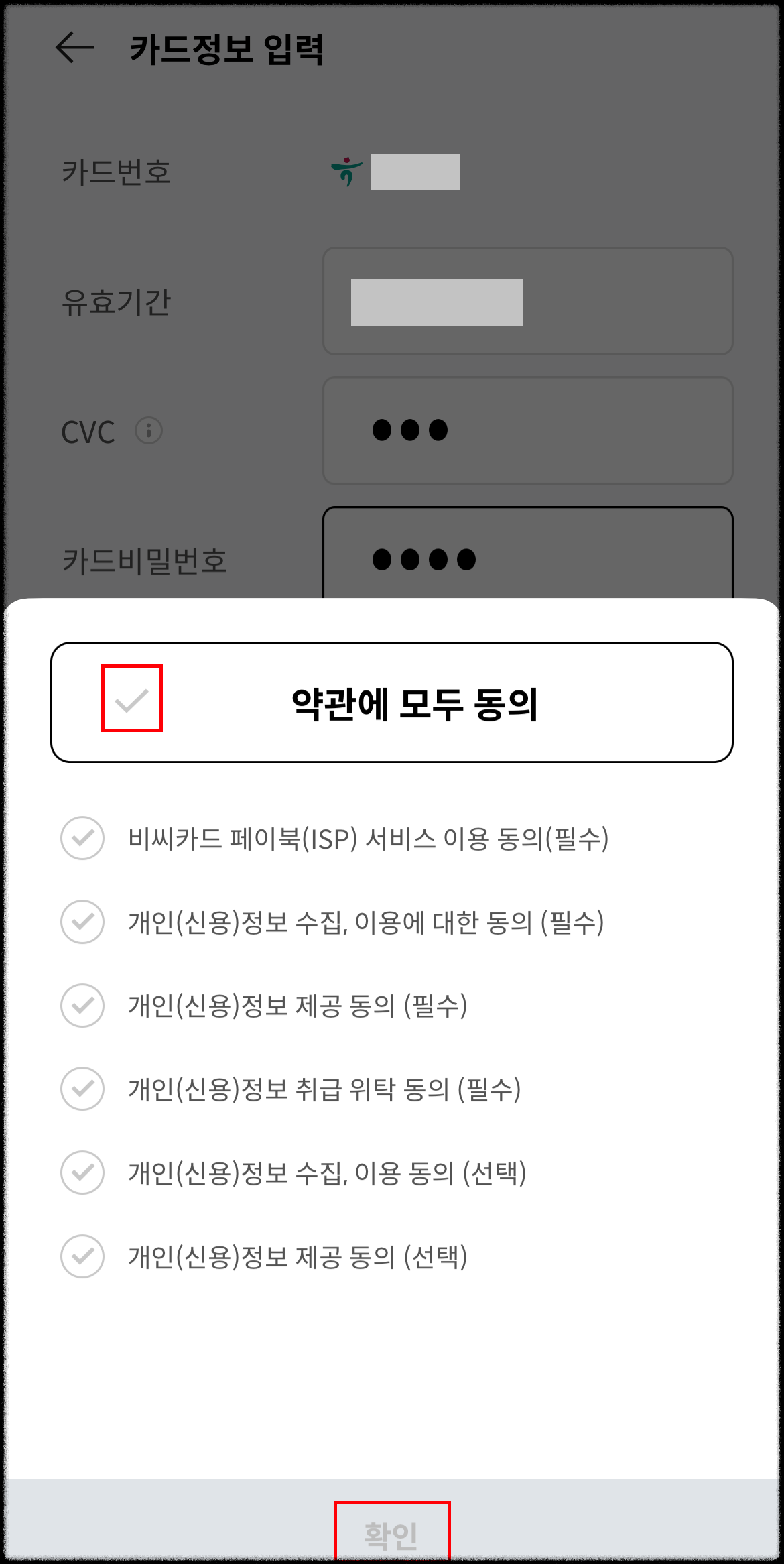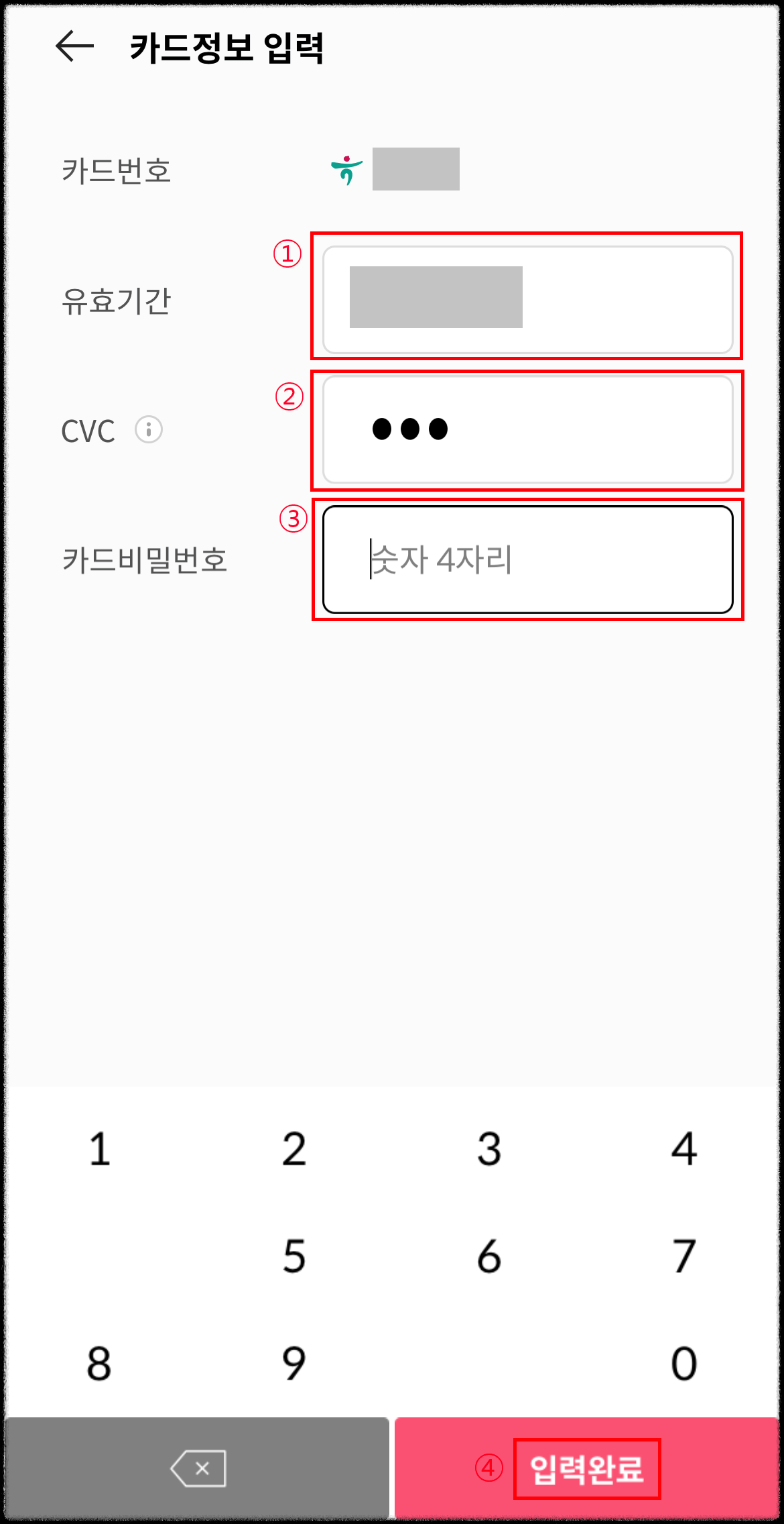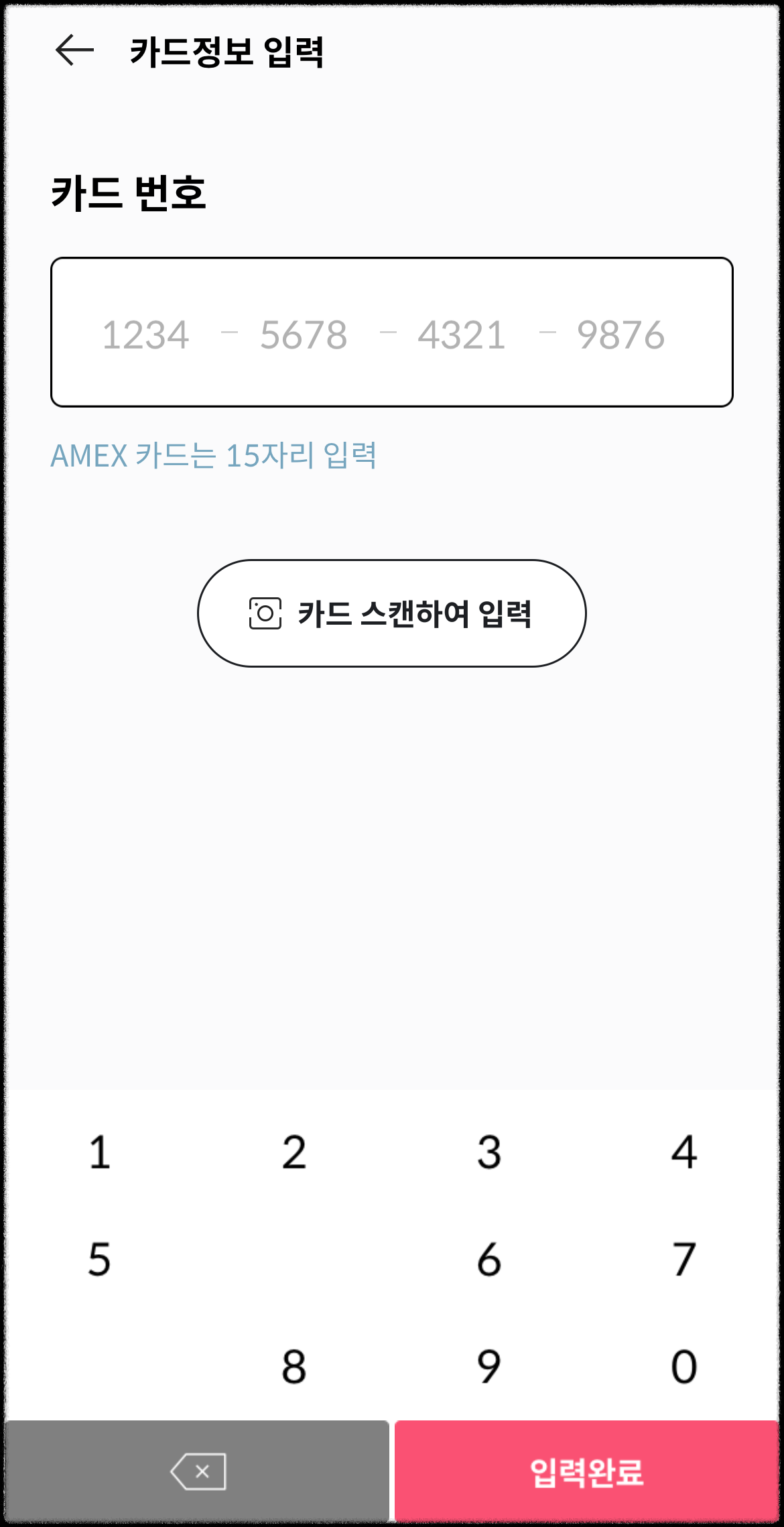 8. 카드정보를 순서대로 입력하고 하단에 입력완료를 누릅니다.