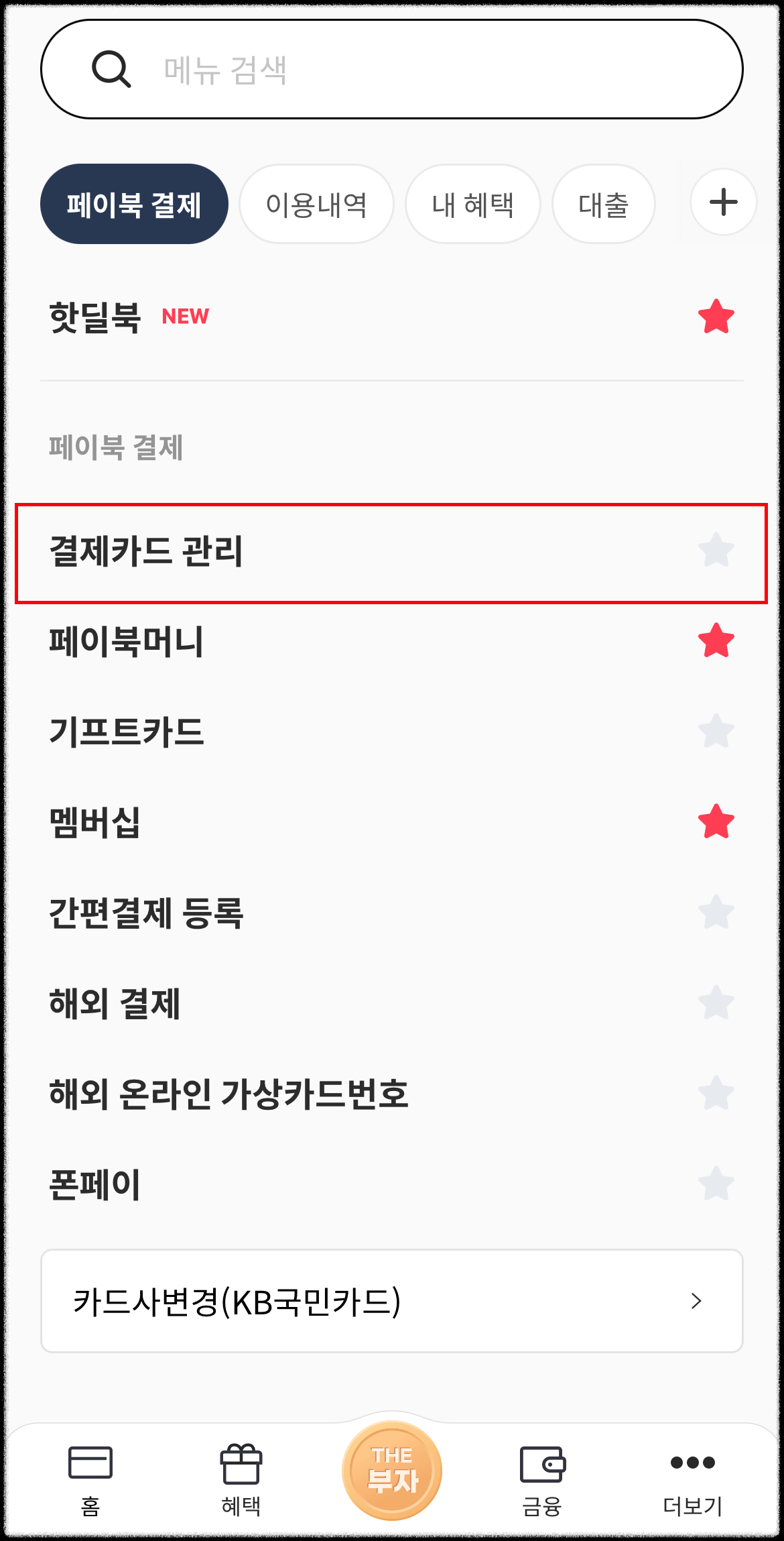 3. 스크롤을 내려서 결제카드 관리를 누릅니다.
