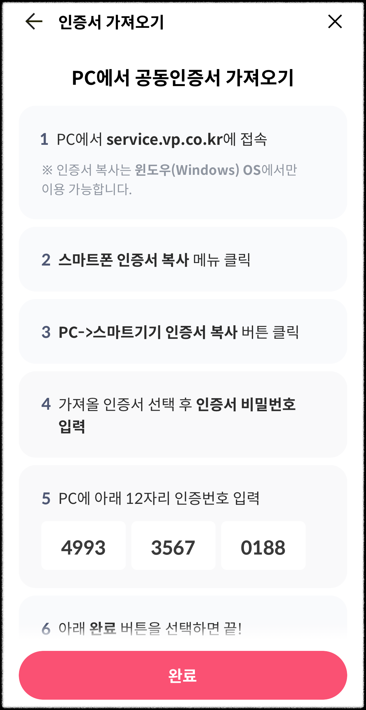 12. 스마트폰에 이 화면을 켜둔 채, PC를 실행하고 service.vp.co.kr에 접속합니다.