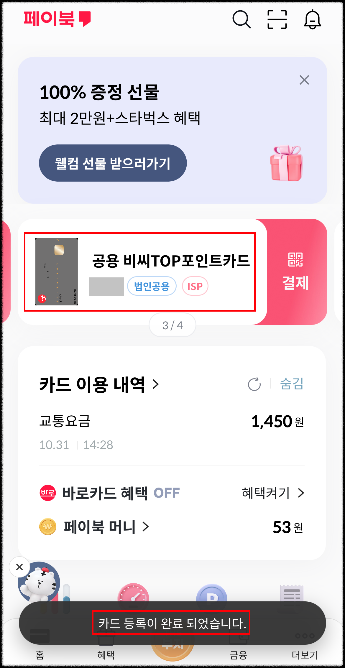 22. 페이북 법인카드 등록이 완료됩니다.
