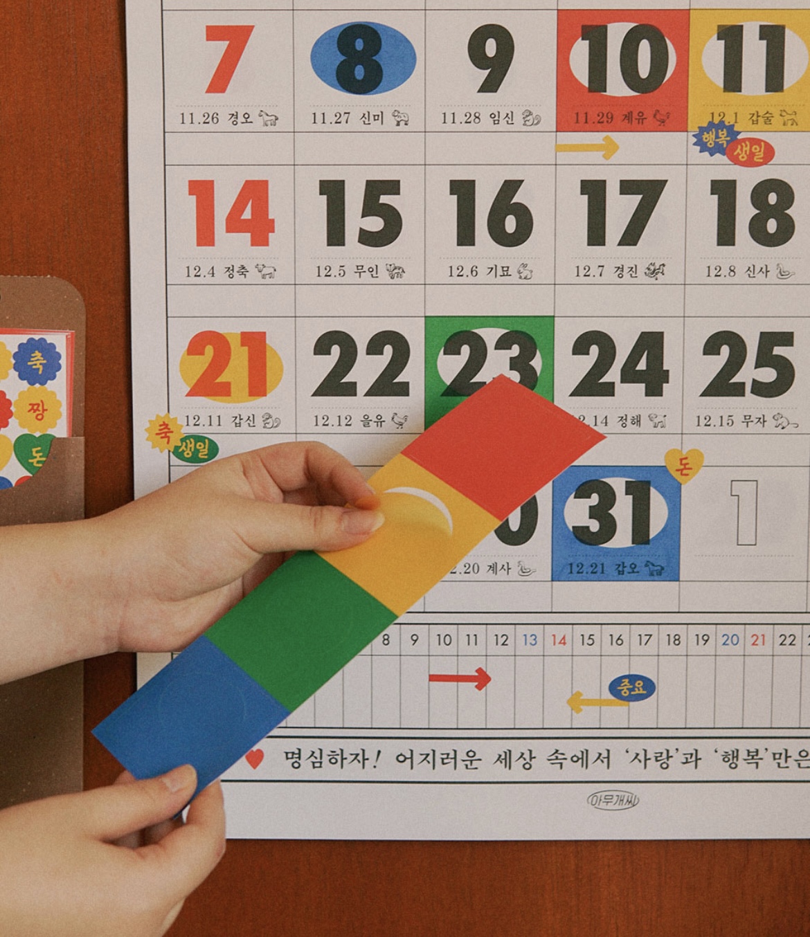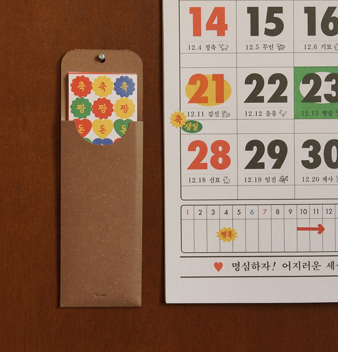 같이 주는 스티커를 통해 기념일과 일정 등을 예쁘게 꾸밀 수 있는 벽걸이 달력입니다.